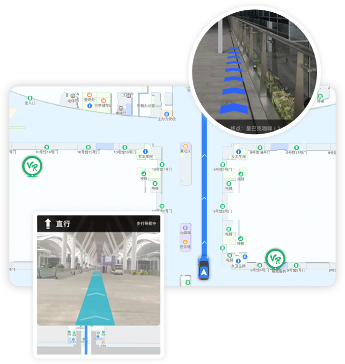 实景导航:利用实景摄像头+渲染LBS服务数据技术,为用户提供实景导航服务,在同步实景后以虚拟标示指引用户到达终点,在沉浸式体验的同时提升了导航中的互动感