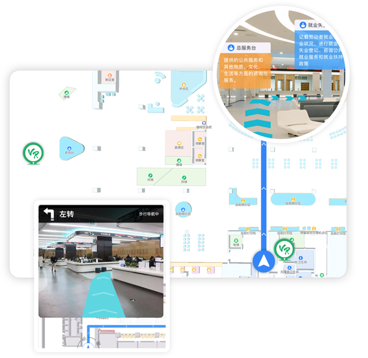 通过专业人员及器材取景,以720°全景+VR技术实现全馆的动态展示,实现整个政务大厅内的VR导航