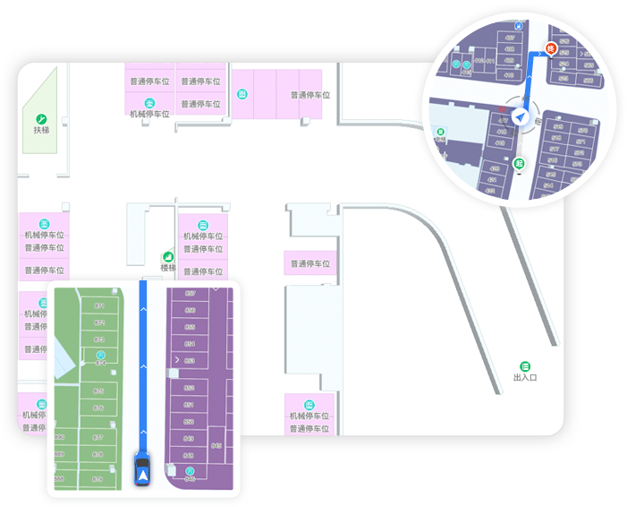附近电梯厅和附近出入口推荐展示,为用车民众指引最近的离场通道,减少民众在停车场逗留时间,提升民众的办事体验